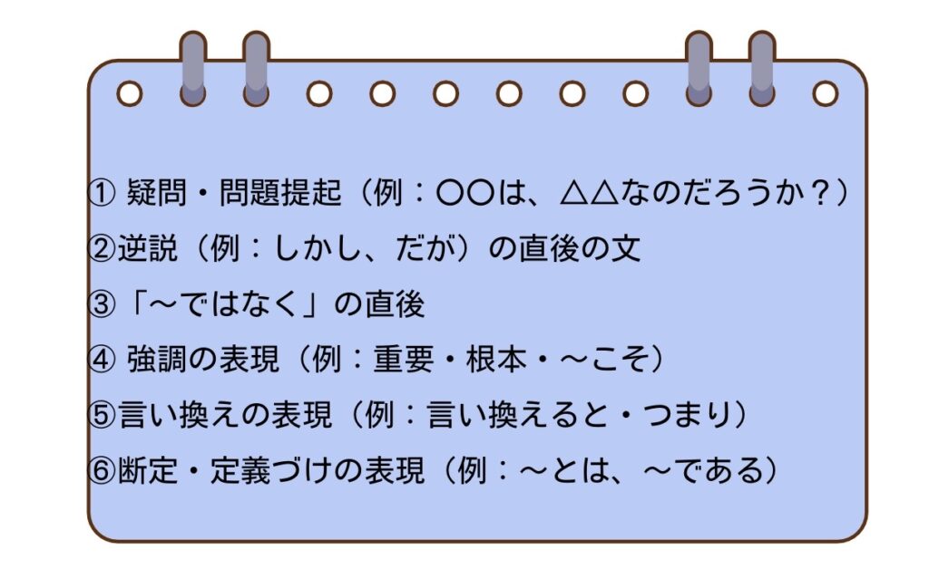 重要な文章を見つけるのに、センスは必要ありません!以下の言葉や表現を見つけたら線を引いてください!