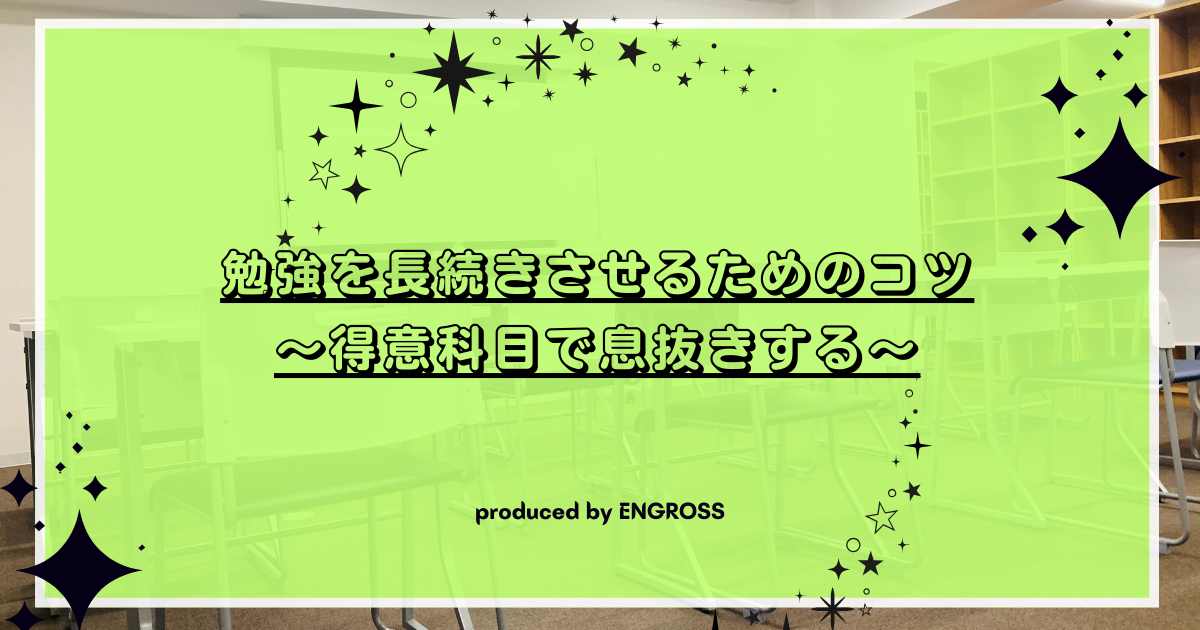 勉強の息抜きとなるとどうしてもゲームなどに流れがちですが、勉強の息抜きを勉強で行うと、勉強時間も確保できて一石二鳥です。意外と有効なので是非試してみてください。